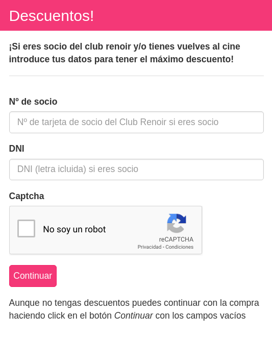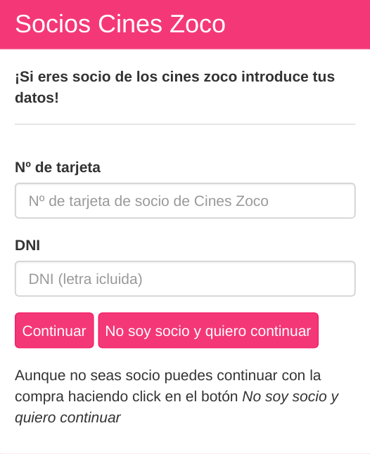 Si bien es cierto, durante el proceso de compra en los cines que tienen tarjetas de socio o fidelización, usted puede rellenar los datos si tiene dicha tarjeta (para acceder a descuentos) o dejarlos en blanco para continuar.