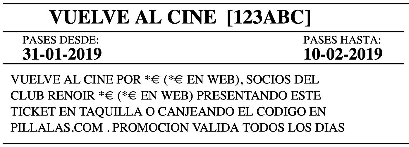 La promoción Vuelve al Cine de la cadena Renoir establece una serie de descuentos que le permiten comprar entradas para pases comprendidos en el período de validez de los mismos a un precio inferior.