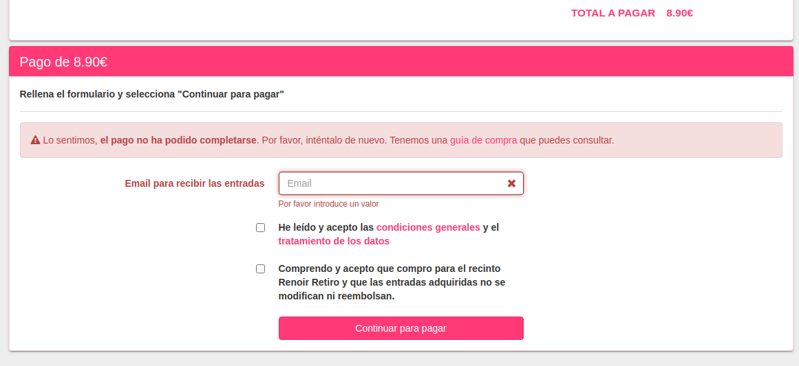 El pago no ha podido completarse y le devolvemos a la página para poder volver a realizar el pago: