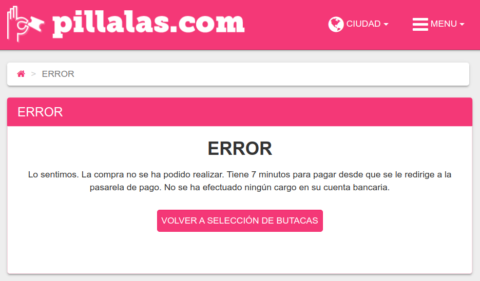 A pesar de realizar todo el proceso de pago correctamente la compra no pudo ser realizada. Esto puede ser debido a multiples causas (tiempo excedido de reserva de las butacas, error de comunicaciones con el recinto, etc.) Aparecerá un error como se muestra en la imagen.