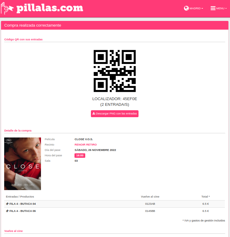 Se mostrará la página de resumen de compra con el código QR y todos los datos para acceder al recinto.